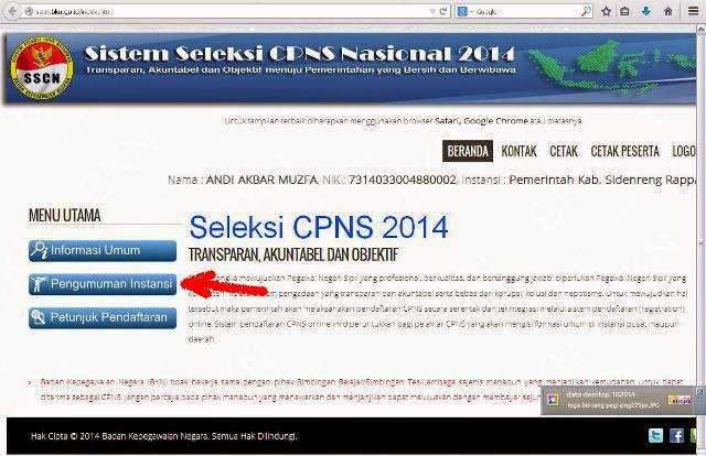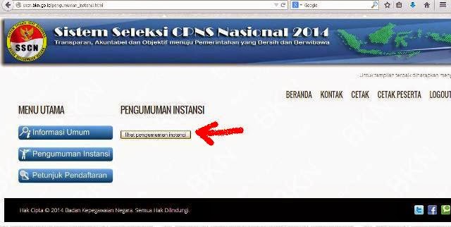 Langkah ketiga : Jika sudah login maka silahkan klik (Pengumuman Instansi) seperti gambar dibawah ini.